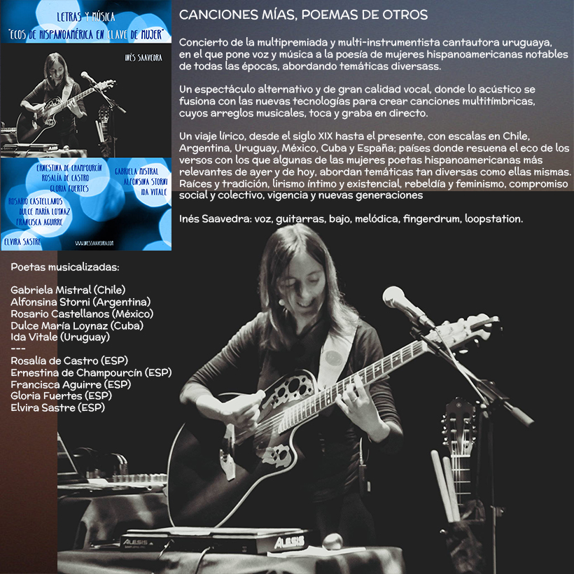 Inés Saavedra es una polifacética cantautora (cantante/compositora), multiinstrumentista y arreglista uruguaya. Cuenta con múltiples reconocimientos, nominaciones y premios, así como varios discos editados (de adultos e infantiles), en los que se destaca su gran calidad vocal y la fusión de estilos musicales en canciones originales, poesías musicalizadas y obras instrumentales.